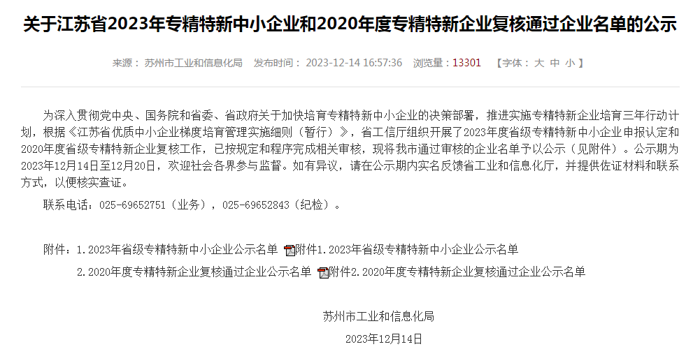 近日,江苏省工业和信息化厅公布了《关于江苏省2023年专精特新中小企业和2020年度专精特新企业复核通过企业名单的公示》。经专家评审及各项综合评定,澳洲幸运5查询结果获评“江苏省专精特新中小企业”。