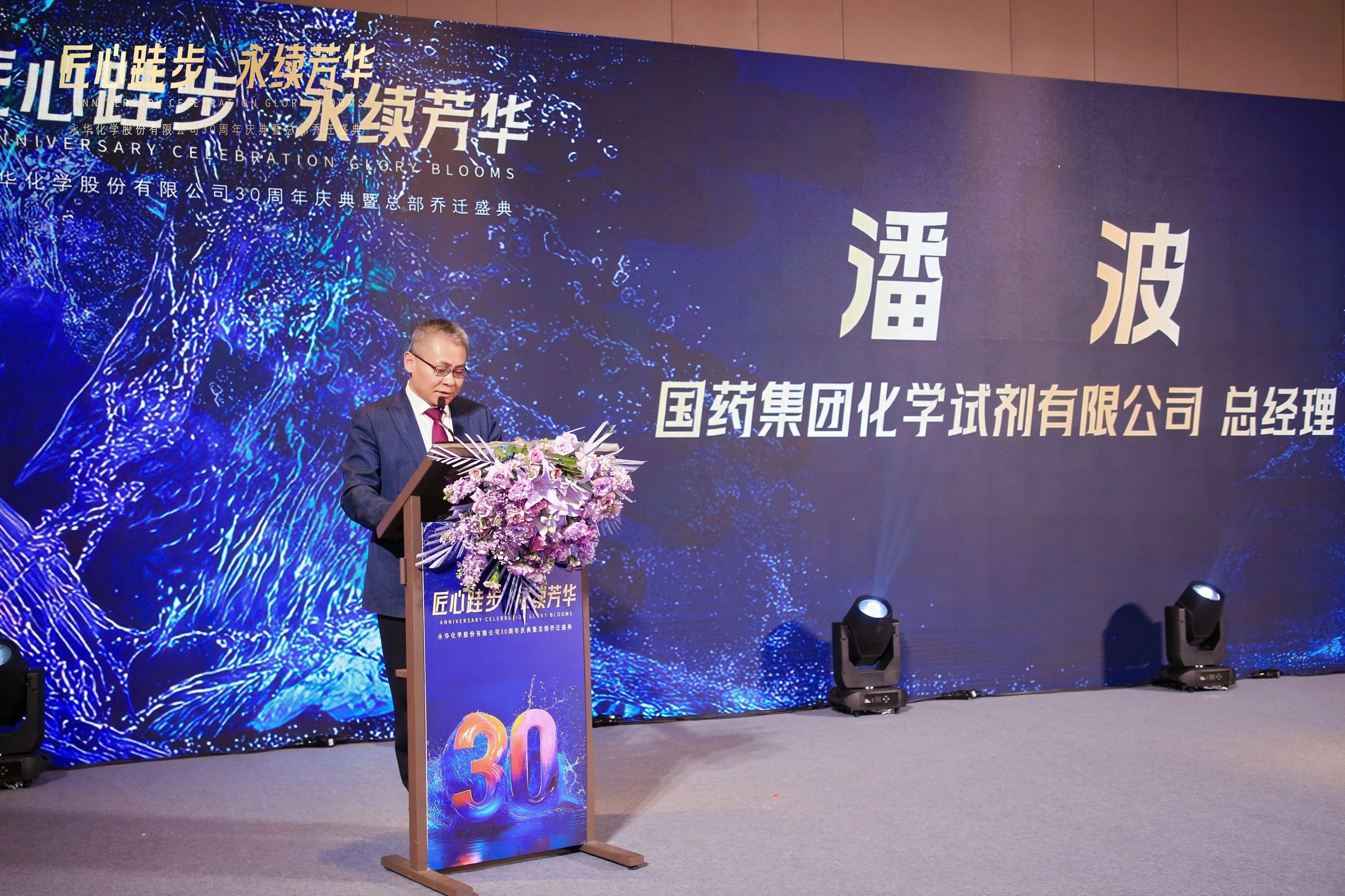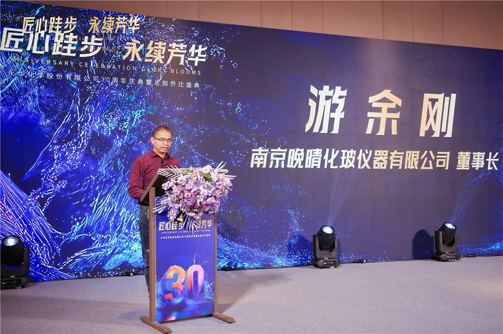 国药集团化学试剂有限公司总经理潘波先生、南京晚晴化玻仪器有限公司董事长游余刚先生、深圳市化试科技有限公司总经理彭日先生作为合作伙伴代表先后上台讲话,分享与永华化学的合作故事,送上真挚祝福。
