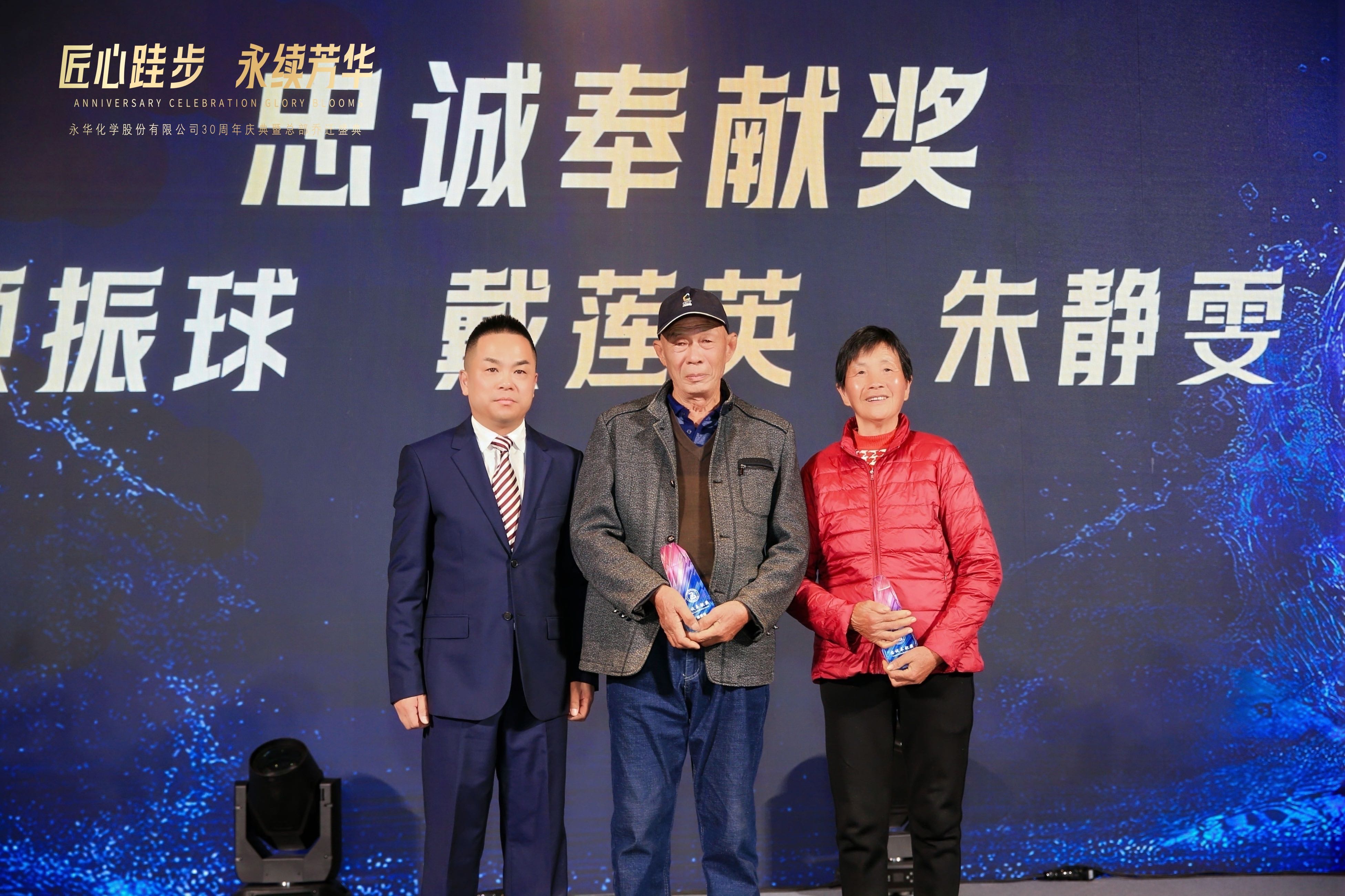 随后,“忠诚奉献奖”颁发给顾振球、戴莲英、朱静雯三位资深老员工代表。他们陪伴永华化学走过数十载春秋,将青春与热血奉献给企业发展,顾学峰总经理为他们颁奖的瞬间,现场掌声经久不息,满是敬意与感动。