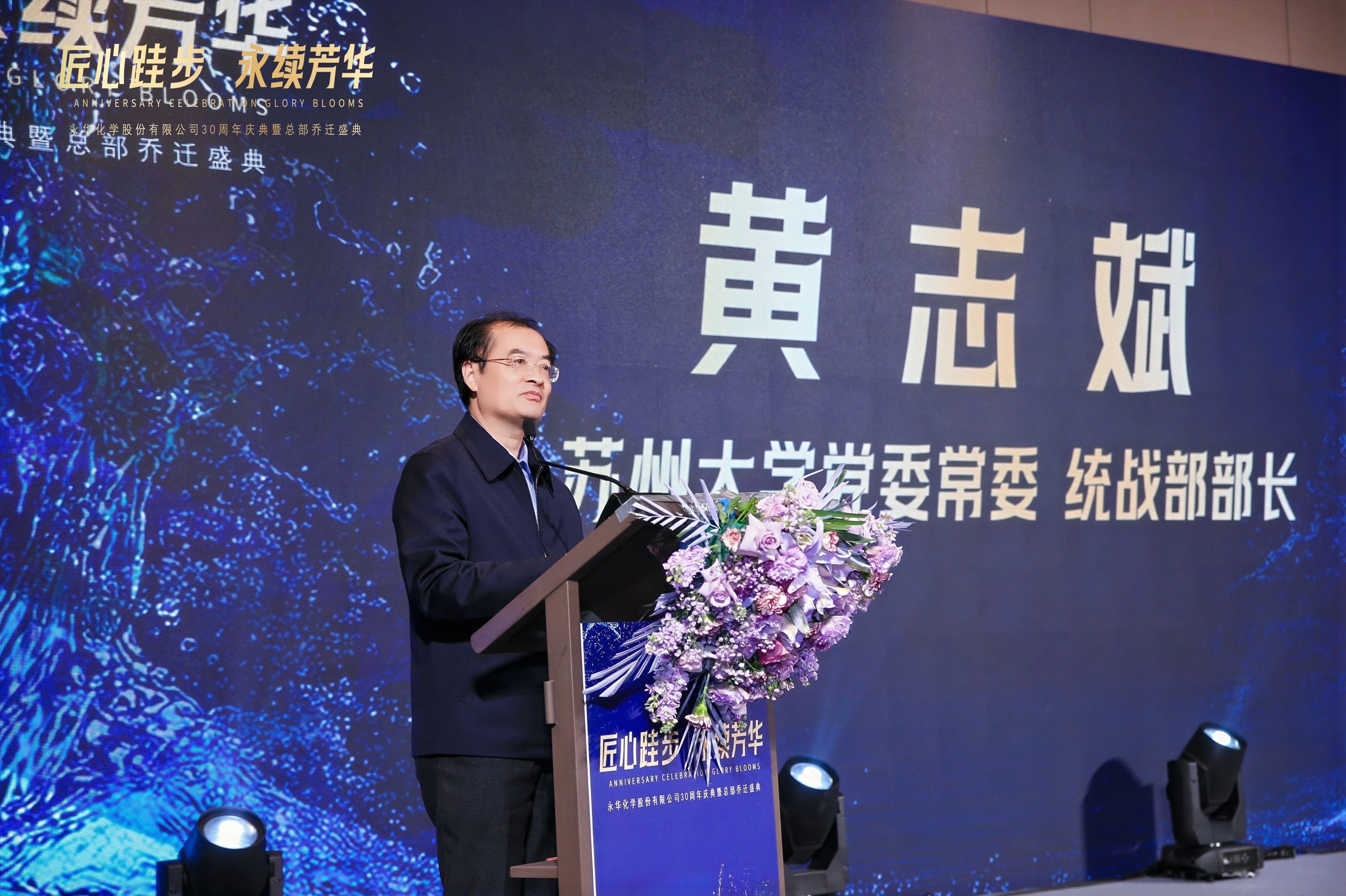 永华化学的创新发展,离不开高校的智力支撑。苏州大学党委常委、统战部部长黄志斌教授上台致辞,对永华化学三十年成就表示祝贺,肯定了双方多年来产学研深度融合的丰硕成果,并表达了未来持续深化合作、共促创新发展的殷切期望。