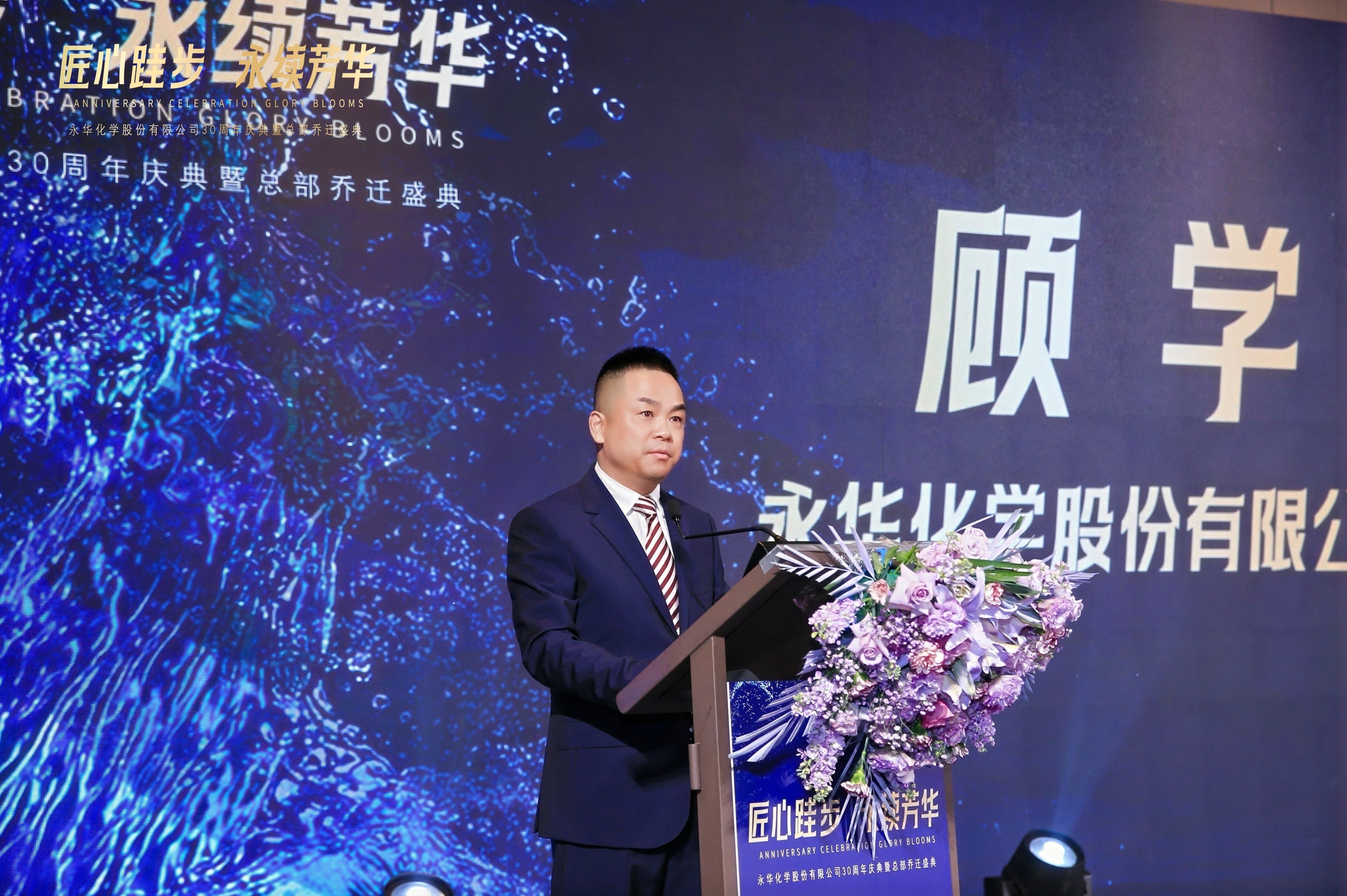 永华化学总经理顾学峰先生率先上台致辞,回顾了公司三十年来的发展历程,感谢合作伙伴的携手同行与全体员工的忠诚奉献,更清晰擘画了未来的发展蓝图。真挚的话语、宏伟的愿景,让现场每一位听众心潮澎湃。
