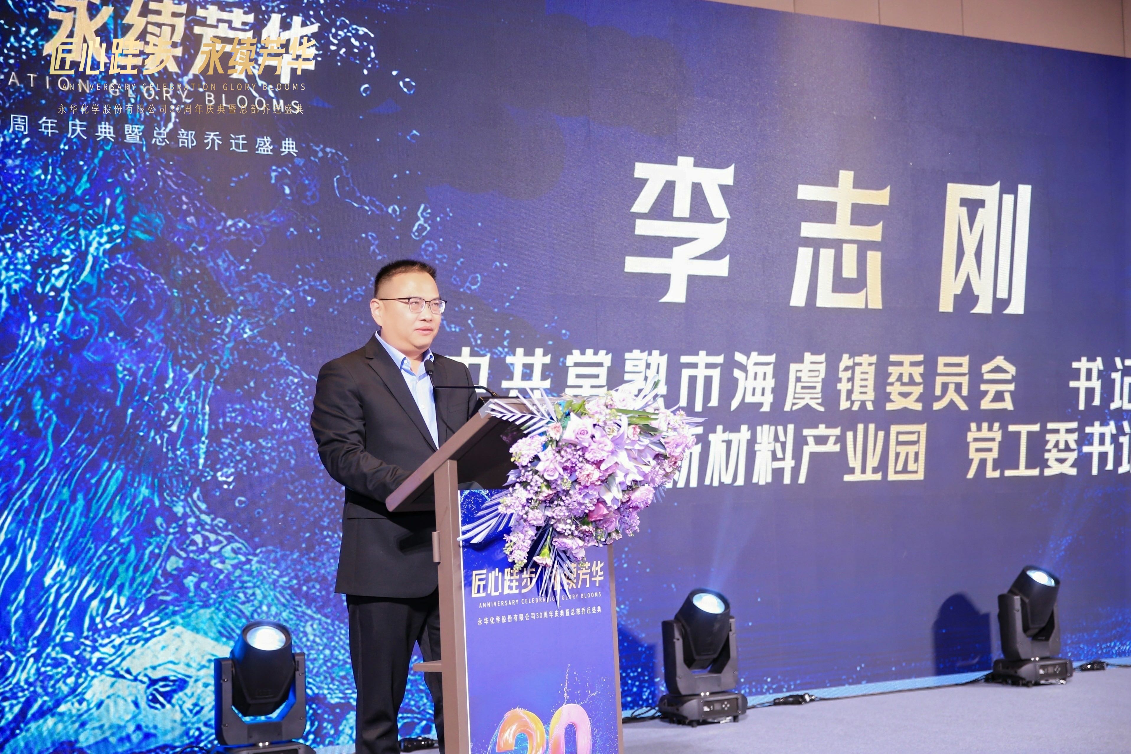 企业的成长,始终根植于地方发展的沃土。中共常熟市海虞镇委员会书记、江苏常熟新材料产业园党工委书记李志刚先生登台,对永华化学三十周年暨总部乔迁表示热烈祝贺,承诺将持续优化营商环境,为企业发展提供坚实保障,期待永华化学在常熟这片热土上再创辉煌。