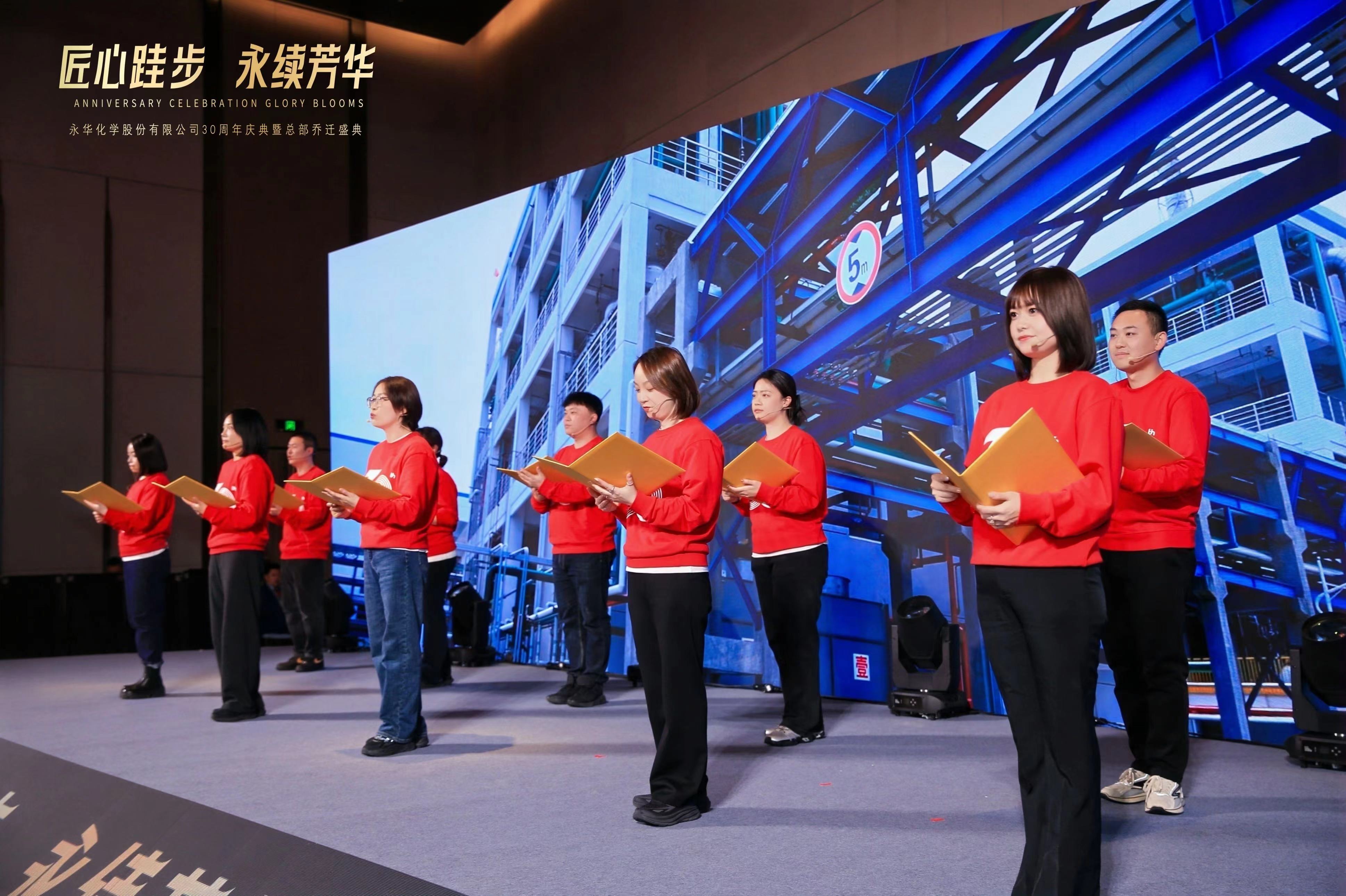 全场灯光渐暗,大屏幕上的30周年主题回顾视频缓缓播放。从初创时的蹒跚起步到如今的行业中坚,从简陋的厂房到崭新的总部,一个个珍贵画面、一幕幕奋斗场景,串联起永华化学两代人的青春与坚守,引得现场阵阵共鸣。
