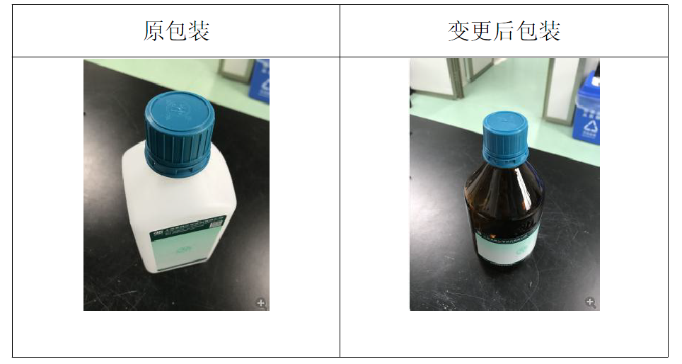 98%甲酸原为500mL 塑料瓶包装含透气盖,由于甲酸能缓慢透过气孔逸出导致包装箱、报告单腐蚀,影响产品外观,经综合考虑,变更为500mL 棕色玻璃瓶包装(含内塞)。